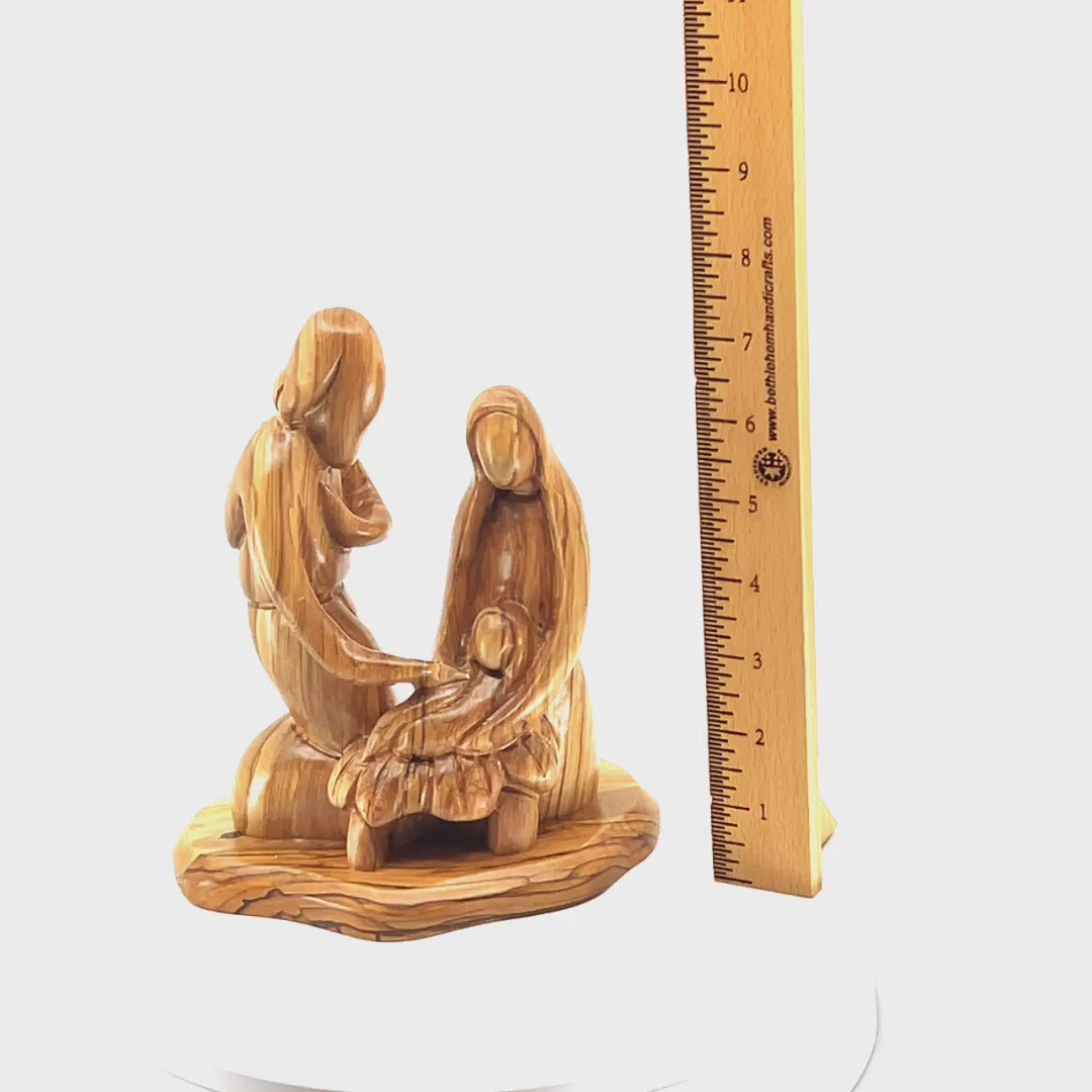 This breathtaking chiseling of aged olive wood portrays a tranquil moment of the Holy Family where Saint Joseph and Virgin Mary lovingly bowing down towards their son, Baby Jesus, who is lying safely in a manger.