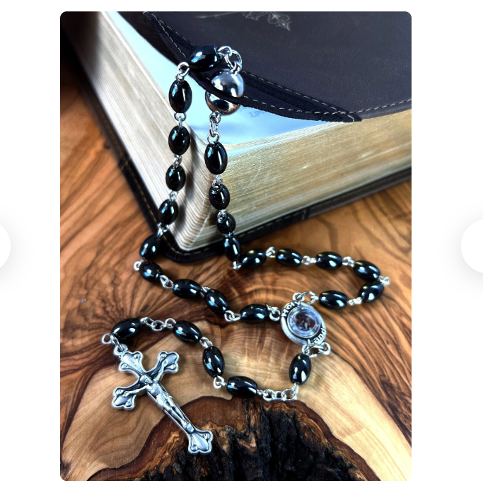 Car Rear View Mirror Rosary with Holy Land Soil, Black Beads