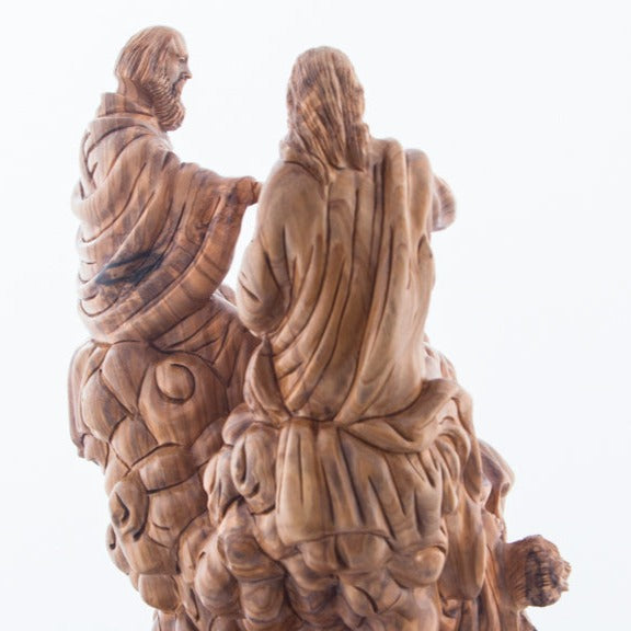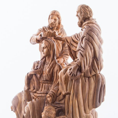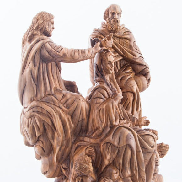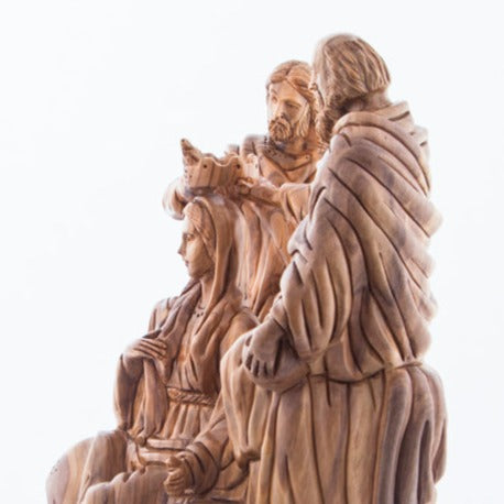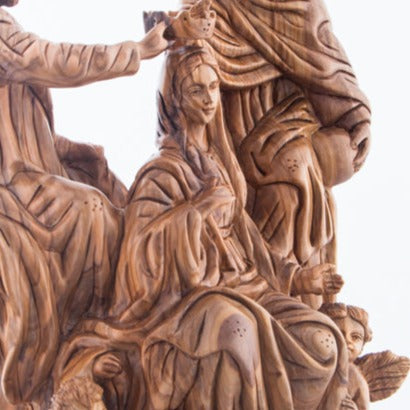 The members of the Holy Trinity in this olive wood carving are placing a crown on the head of Mary as Queen of Heaven. Observe this olive wood sculpture of the Coronation of the Blessed Virgin that is painstakingly hand carved by Christian artisans from Bethlehem.