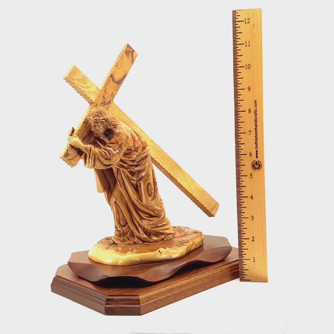 This is a beautiful sculpture carved from Bethlehem's olive wood cries forth the excruciating pain of Christ's passion as he drags his cross to his death as blood drips from his head crowned with thorns.