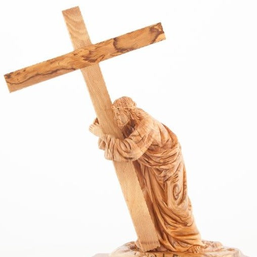 This 13" handcrafted Jesus Christ "Holding Cross" Wooden Sculpture is made of Bethlehem Holy Land Olive Wood, a unique and beautiful material. The sculpture is carved into a stunning and touching representation of Jesus Christ carrying the cross. Buying this product not only supports the expert Christian artisans in Bethlehem, but also provides a meaningful and thoughtful Easter gift or an elegant piece of home decor.