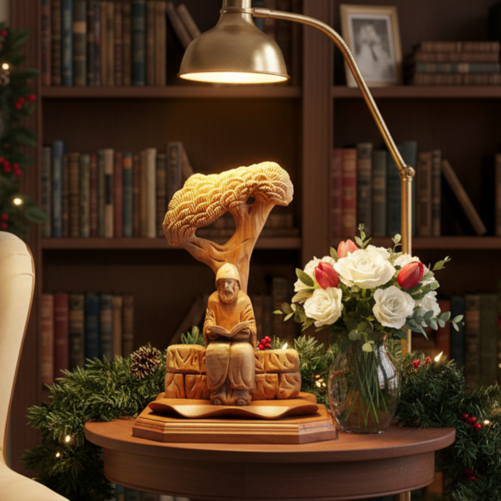 St. Charbel Under Cedar Tree, Wooden Sculpture 10.8"
