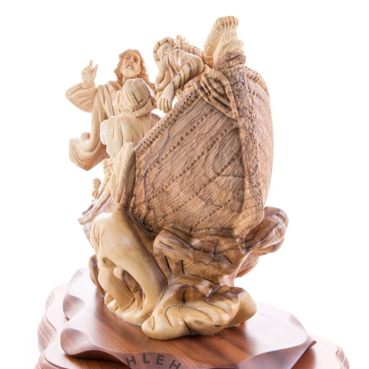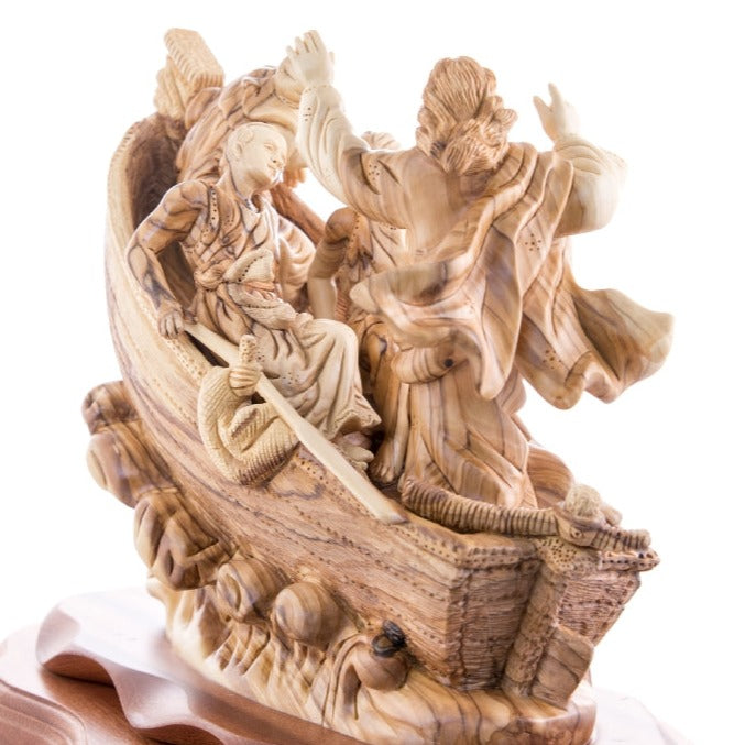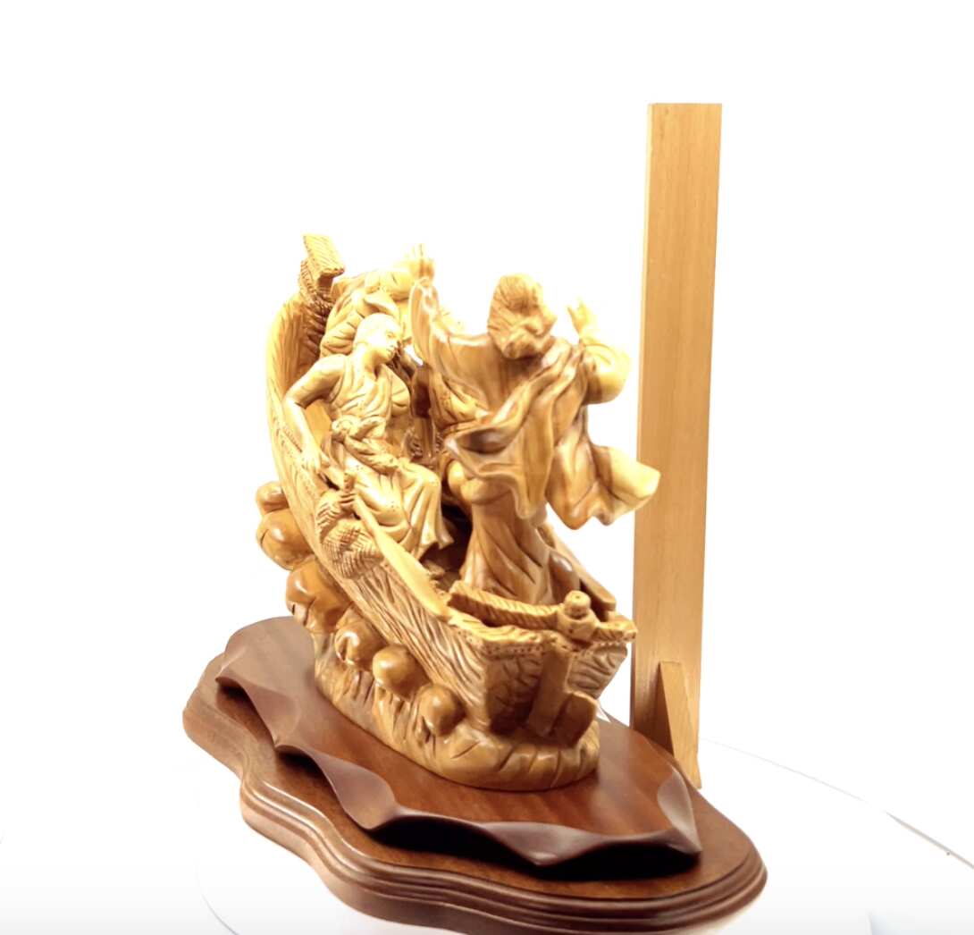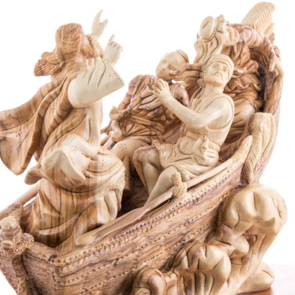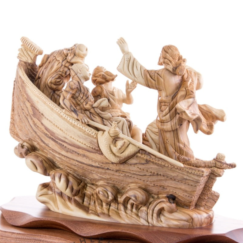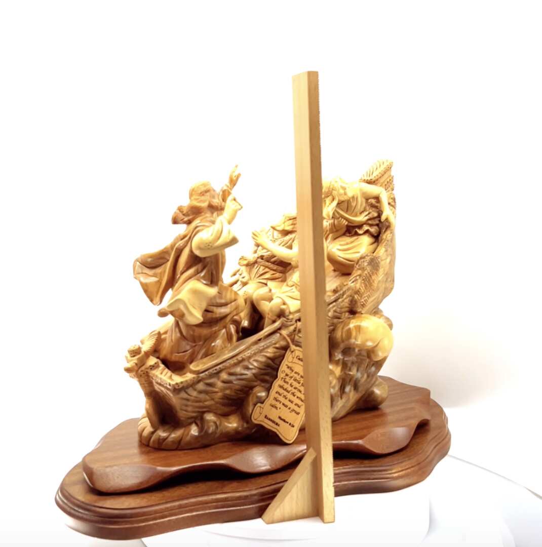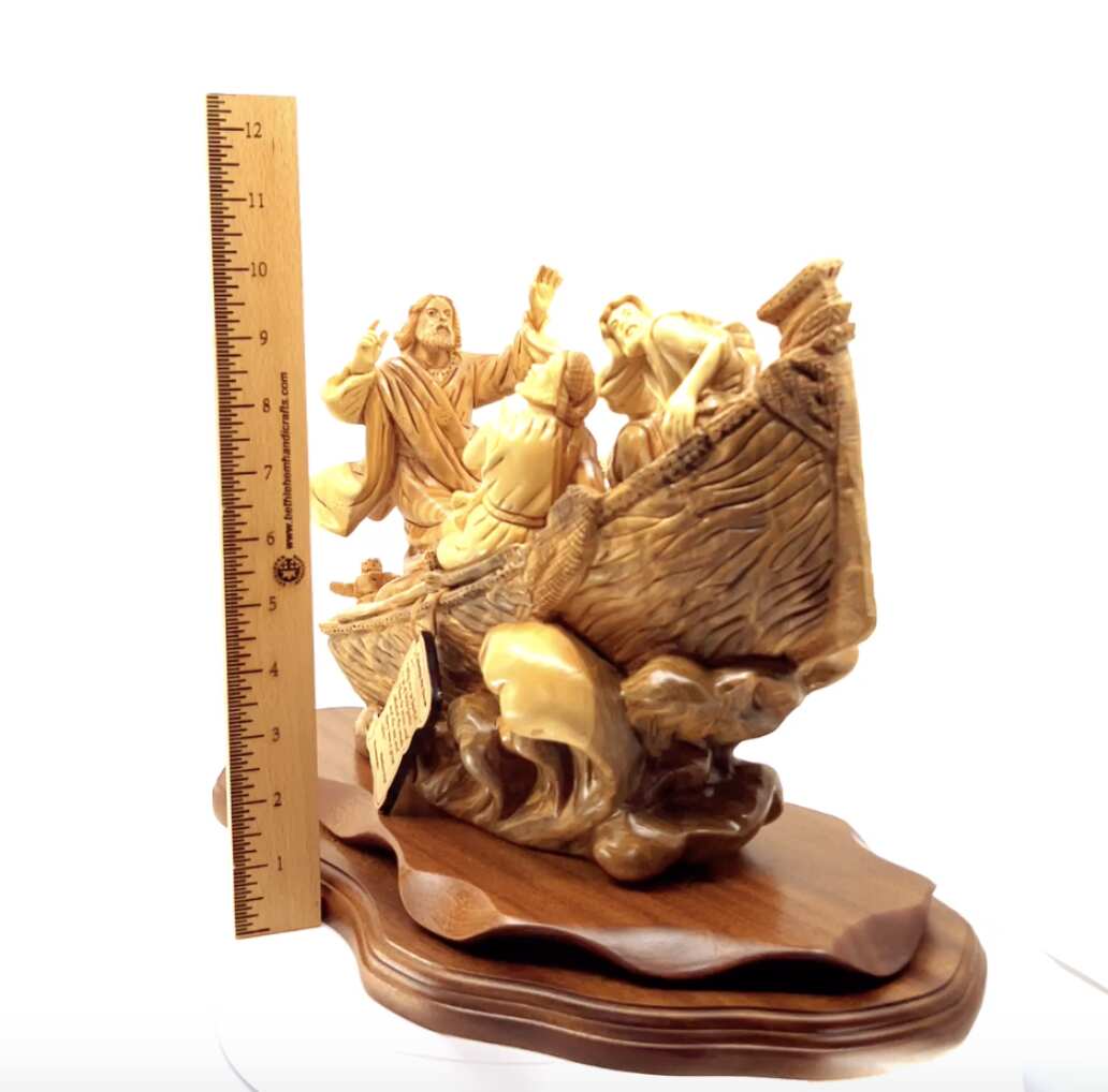 This outstanding Bethlehem Olive wood piece represents the tremendous miraculous incident when Jesus calmed down the storm in the middle of the sea due to the fear of his disciples, it depicts the divine power of Jesus Christ and the comfort believers find in and through him.