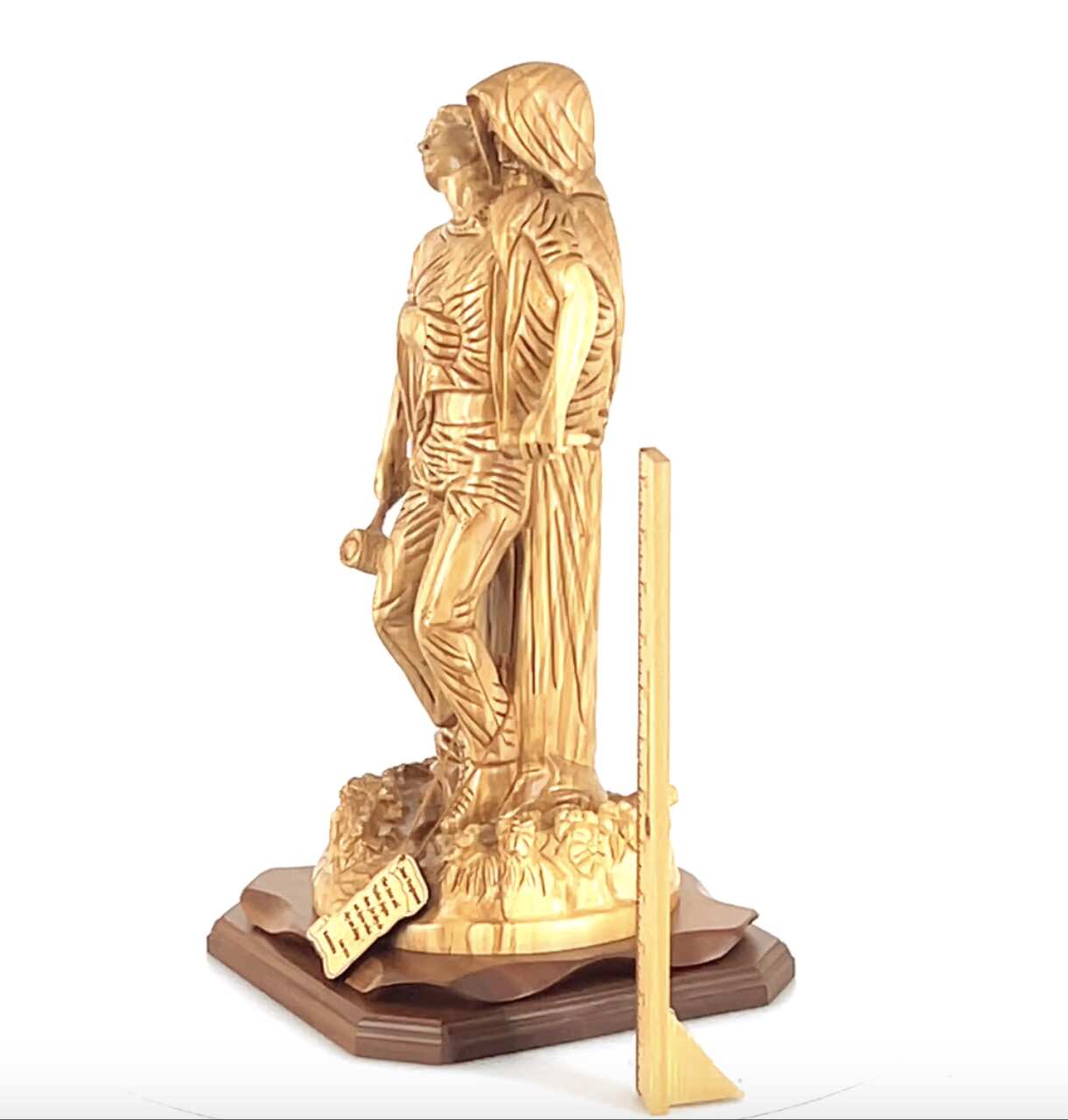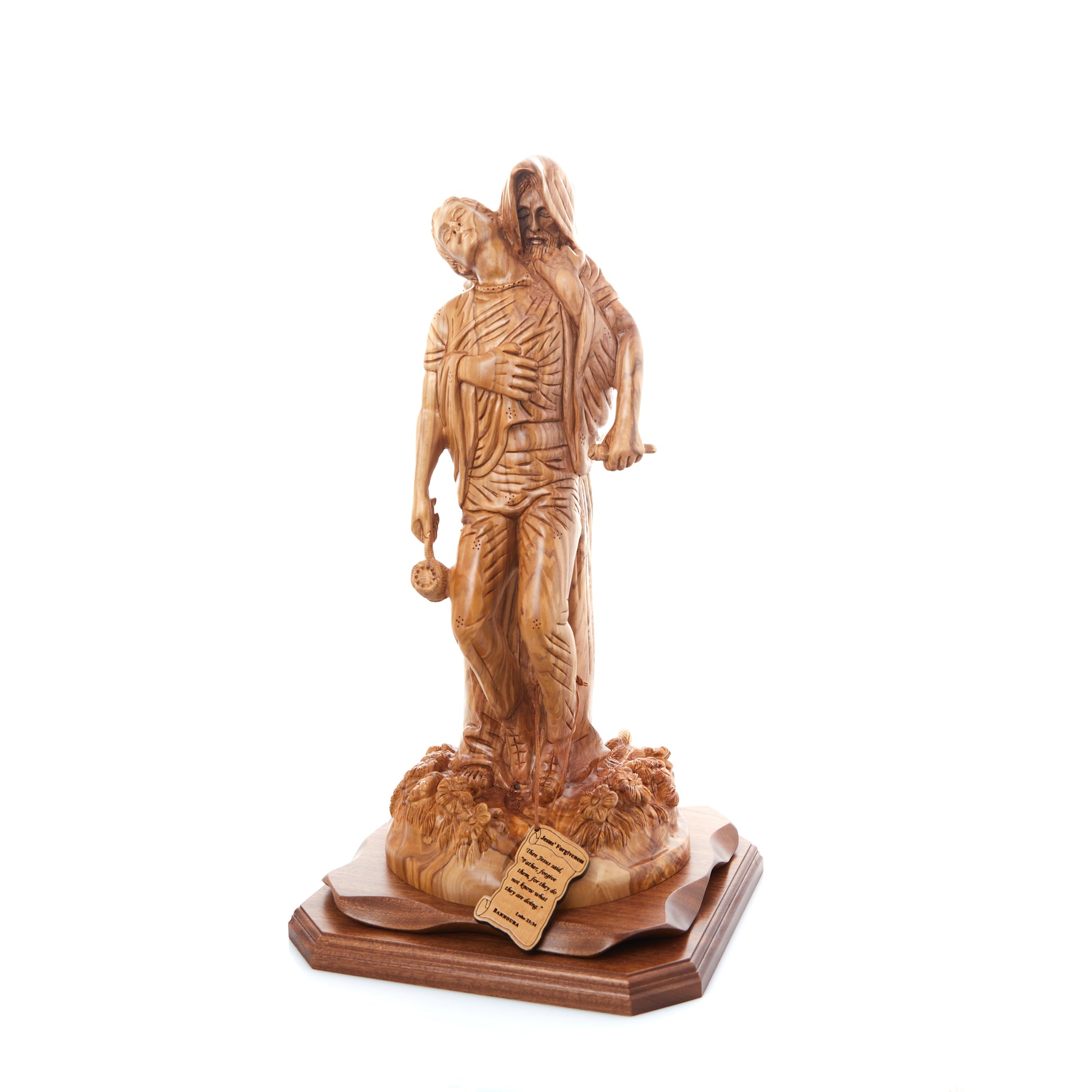 This breathtaking piece of wood comes to you straight from the Holy Land to remind you of the utmost forgiveness of God. You can see from this image the amount of detailed curvature that has been done on this olive wood piece to precisely deliver this haunting scene of Jesus gently holding one of the Roman soldiers who nailed him to the cross.