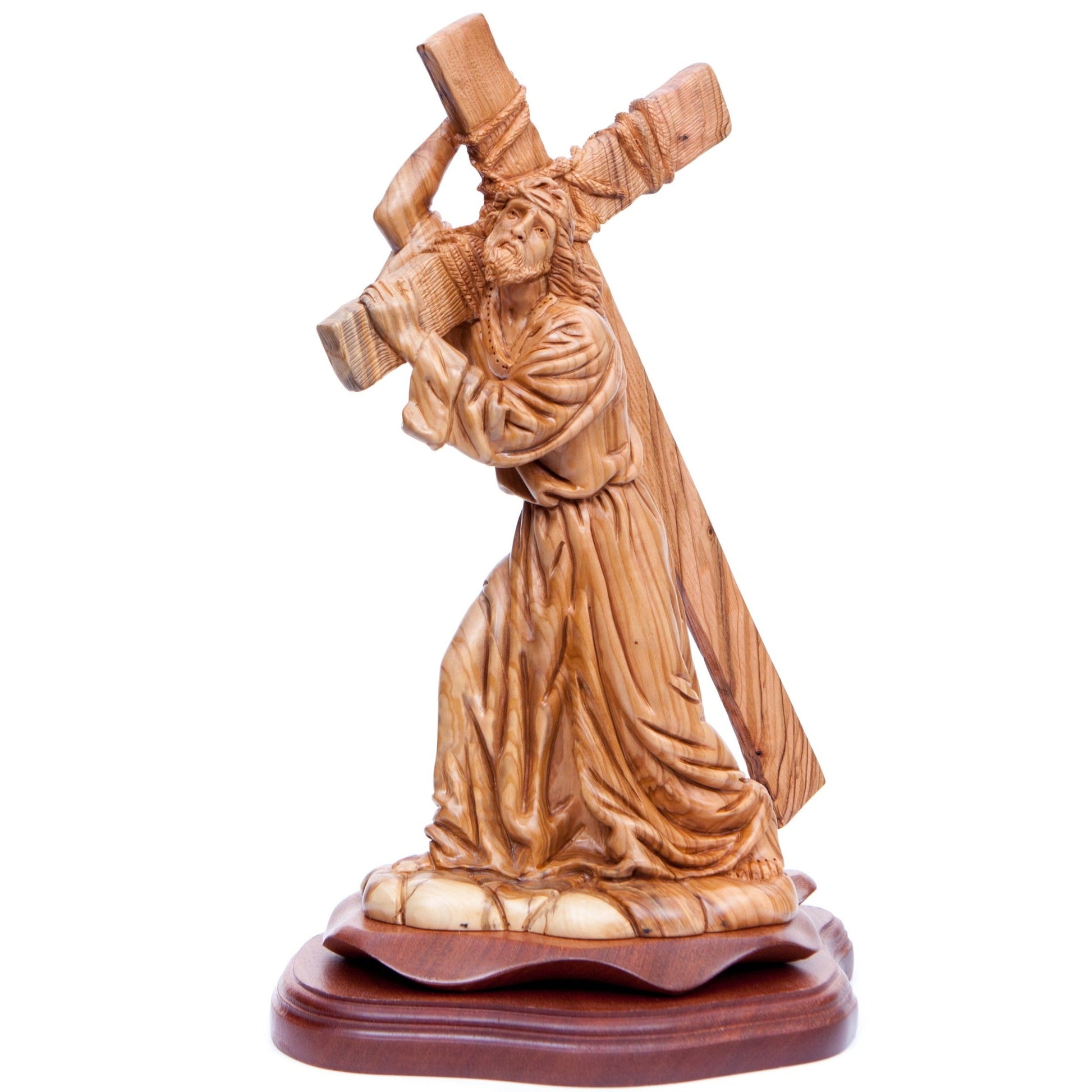 Jesus Christ Carrying Cross, 13.8" Wood Carving from Holy Land