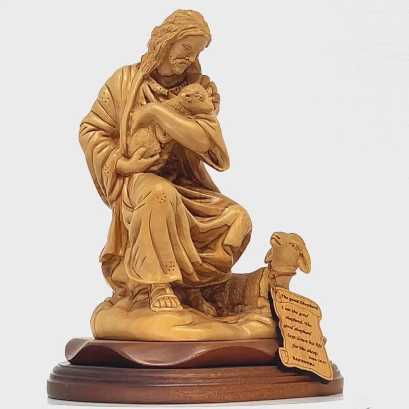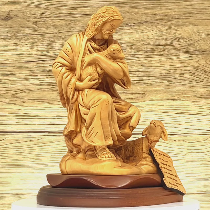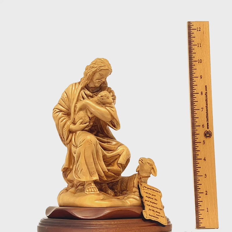 This carved olive wood statue made in Bethlehem in the Holy Land shows Christ "The Shepherd" with his endless love to his children "sheep".