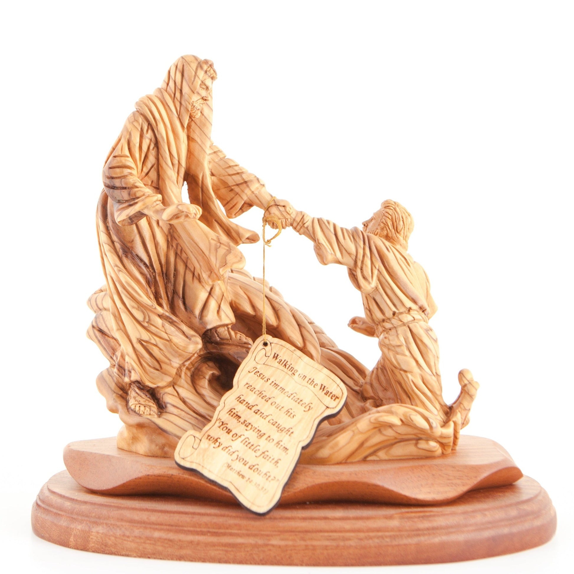 This sculpture comes with the verse "Jesus immediately reached out his hand and caught him, saying to him "You of little faith, why did you doubt?" (Matthew 14:31)" tied on it. Get this uniquely carved piece to decorate your house, office, school and workplace with the blessing of the Holy Land's olive wood.