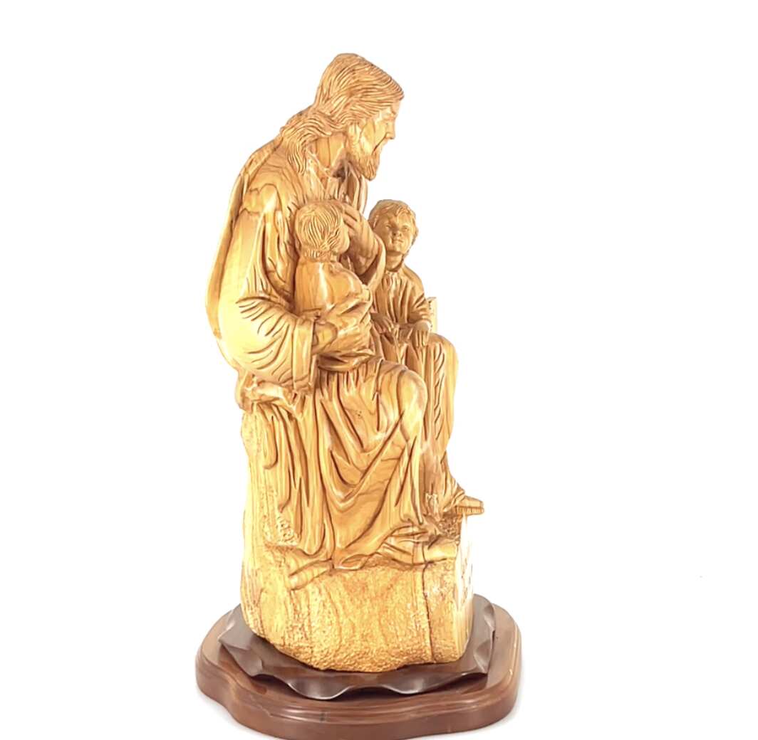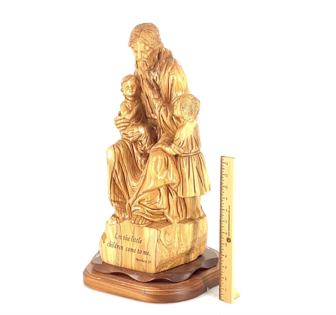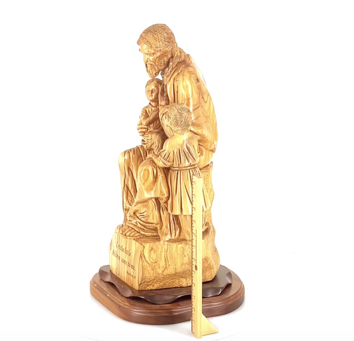 Mark 10:13-16 This greatly carved olive wood Jesus statue represents the tremendous and endless love of Christ to the children. Keep a handmade carved statue from Bethlehem, the Holy Land in your house and hearts.