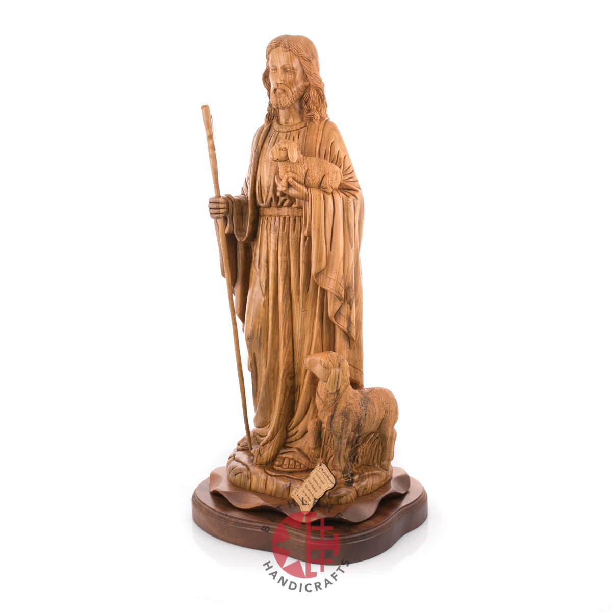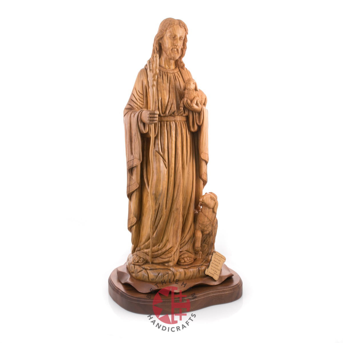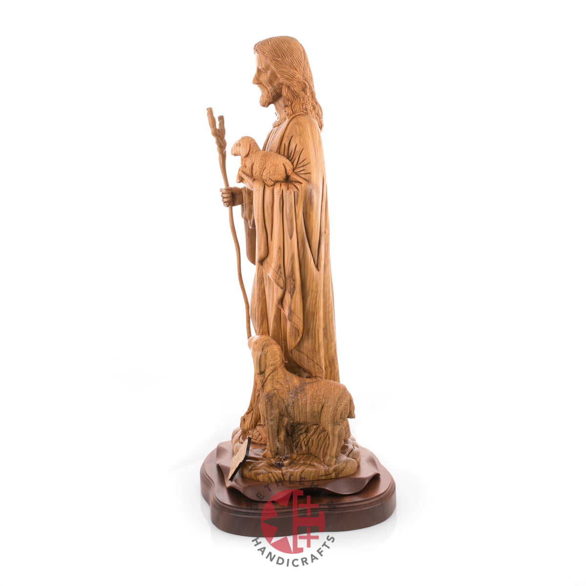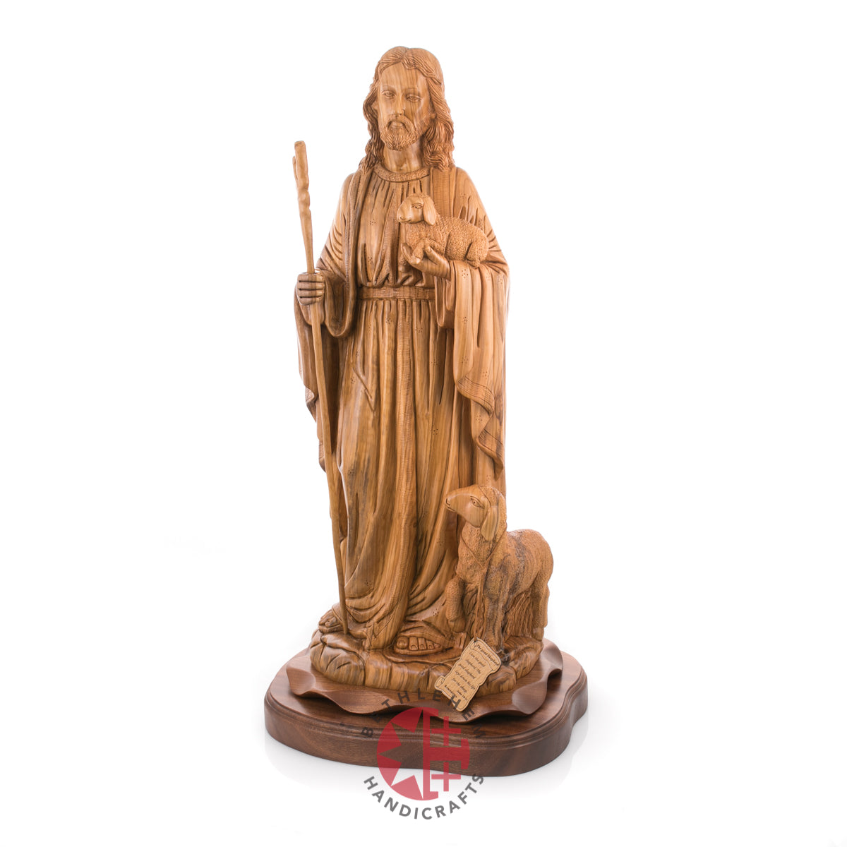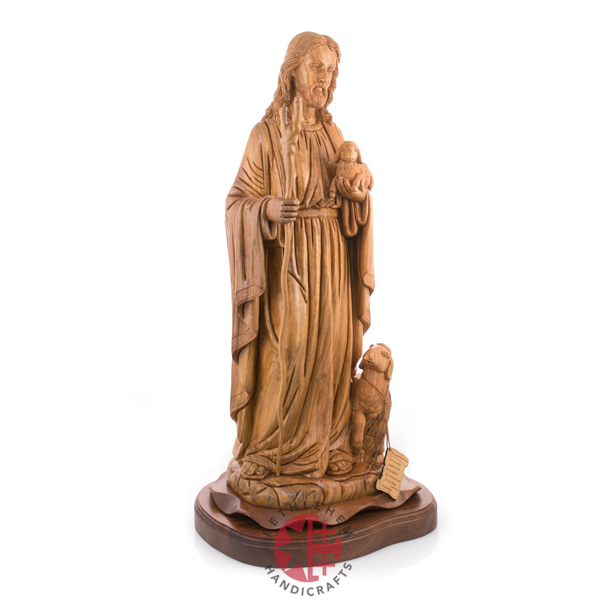 "Rejoice with me; for I have found my sheep which was lost." Luke 15:4-7. This handmade olive wood carved statue represents Jesus as our savior and the good Shepherd and represents us "followers" through the sheep.