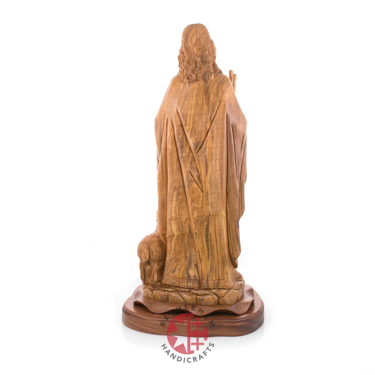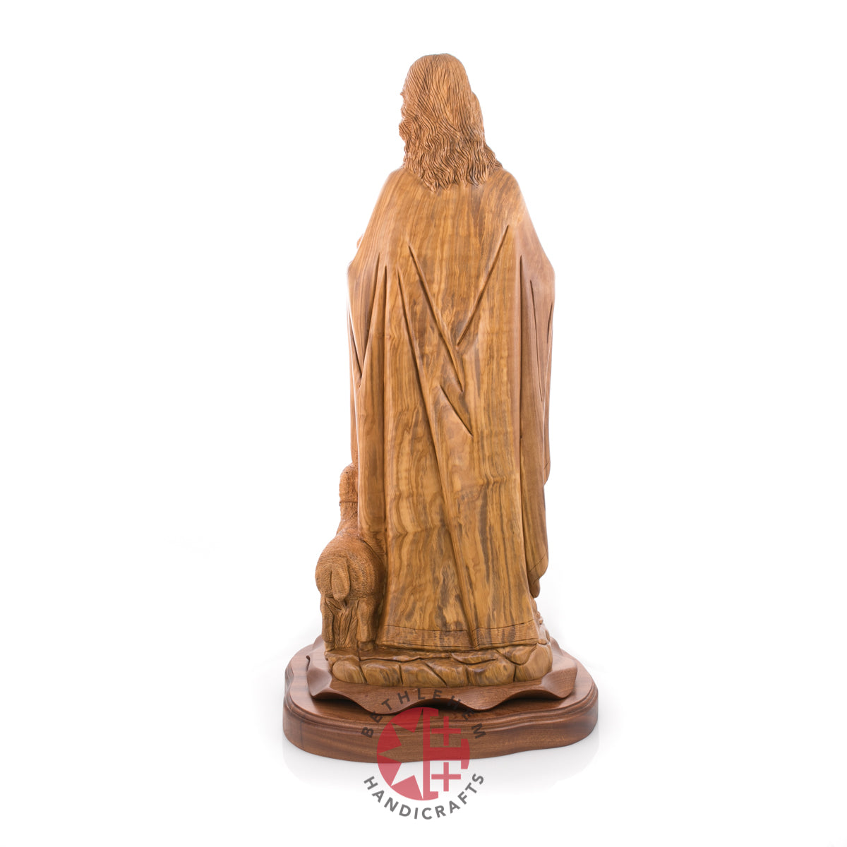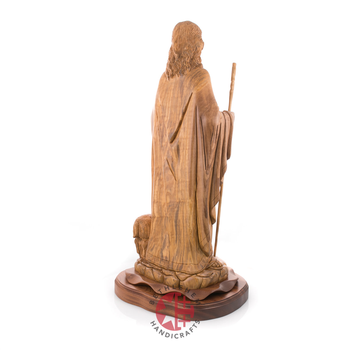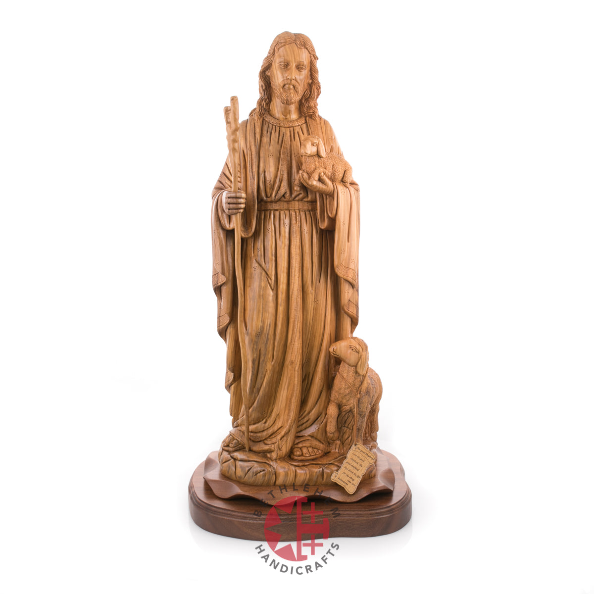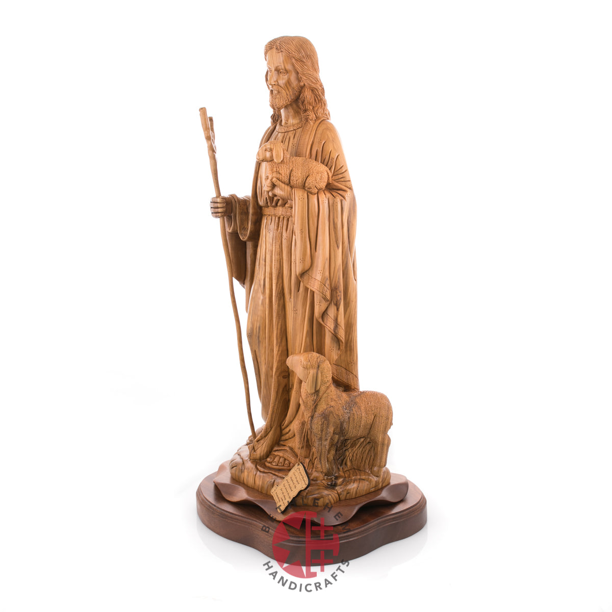 "Rejoice with me; for I have found my sheep which was lost." Luke 15:4-7. This handmade olive wood carved statue represents Jesus as our savior and the good Shepherd and represents us "followers" through the sheep.