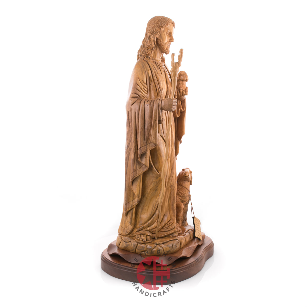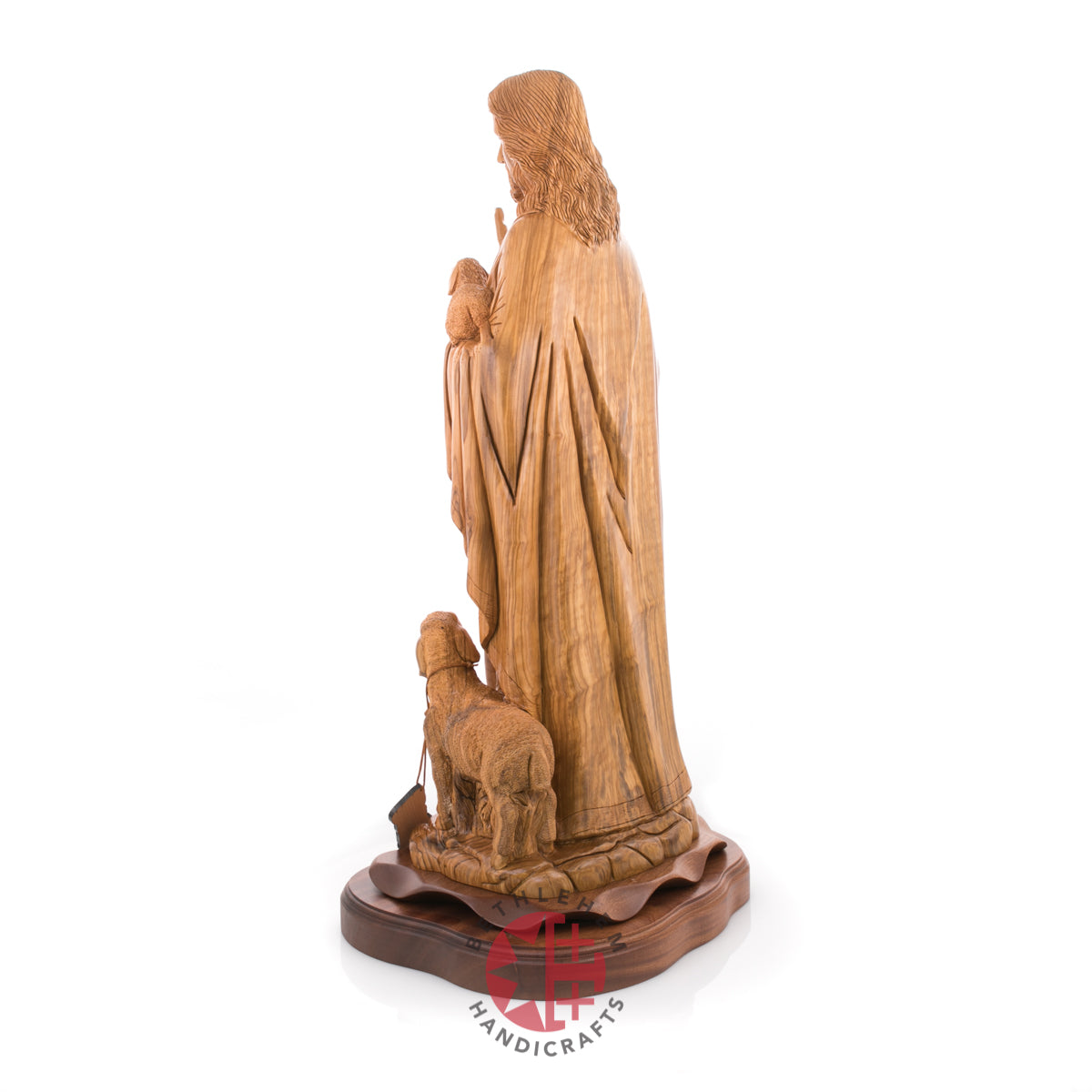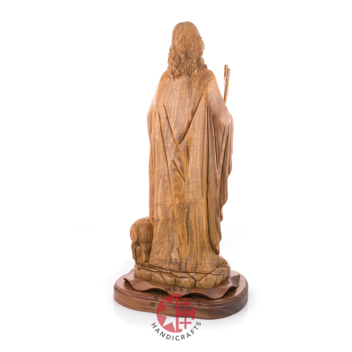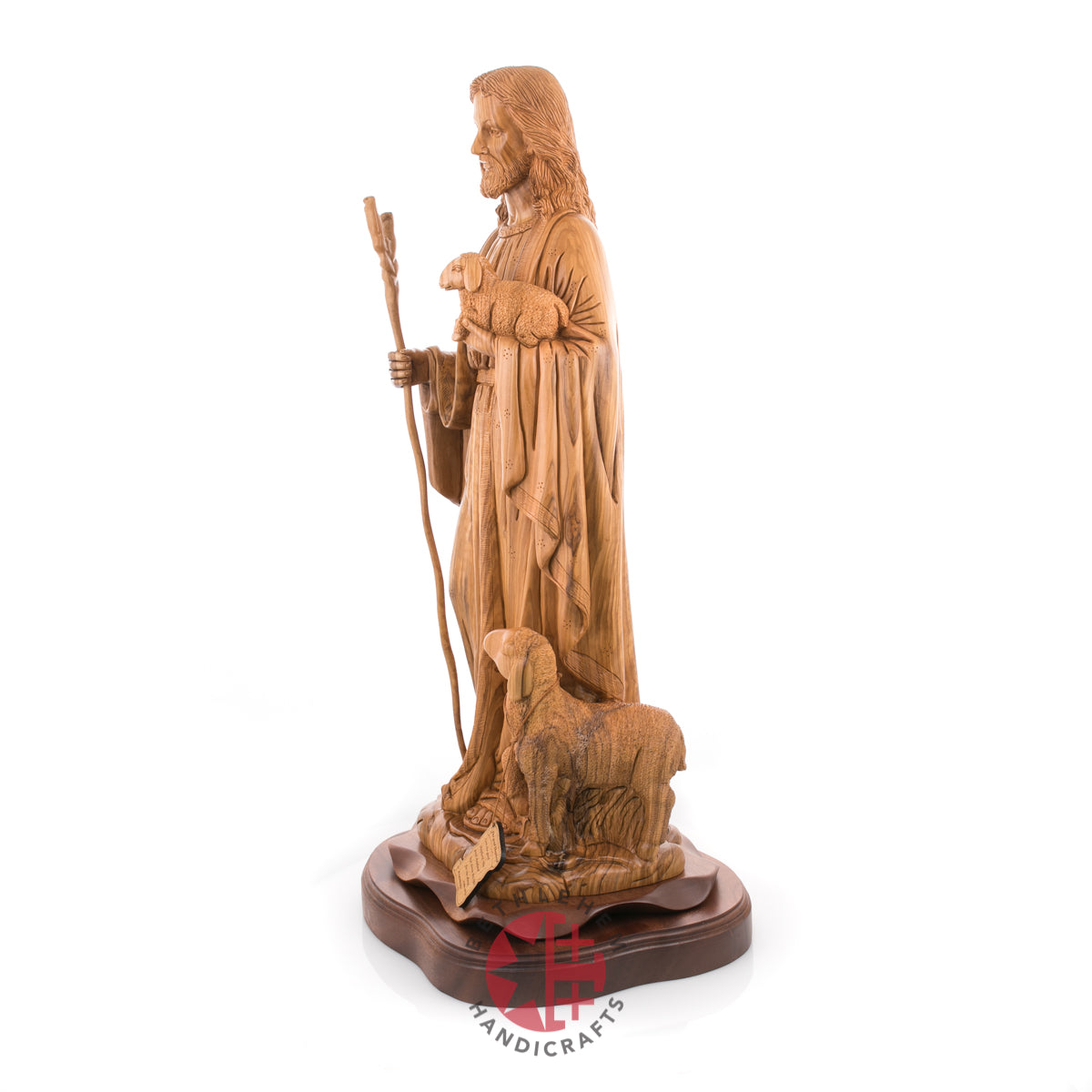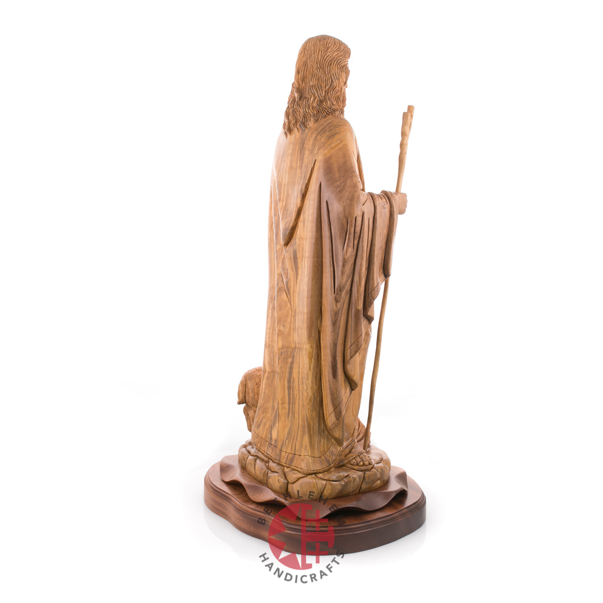 "Rejoice with me; for I have found my sheep which was lost." Luke 15:4-7. This handmade olive wood carved statue represents Jesus as our savior and the good Shepherd and represents us "followers" through the sheep.