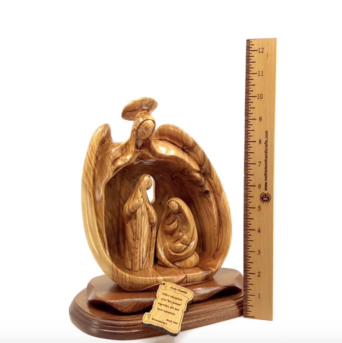 Holy Family with Angel Nativity, 10.2" Carved Abstract Olive Wood Statue from Holy Land, Made bu Christian Artisans.