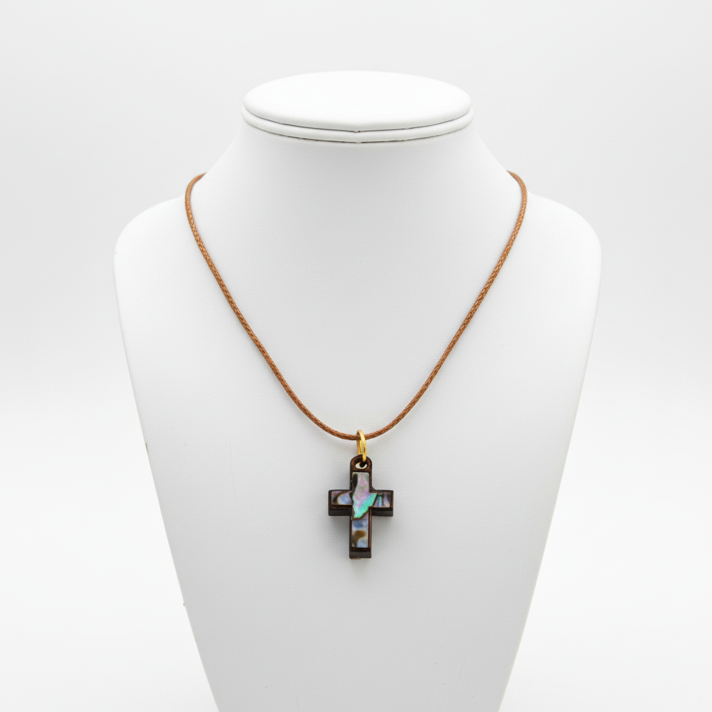 Olive Wood Cross Necklace with Colorful Mother of Pearl inlay