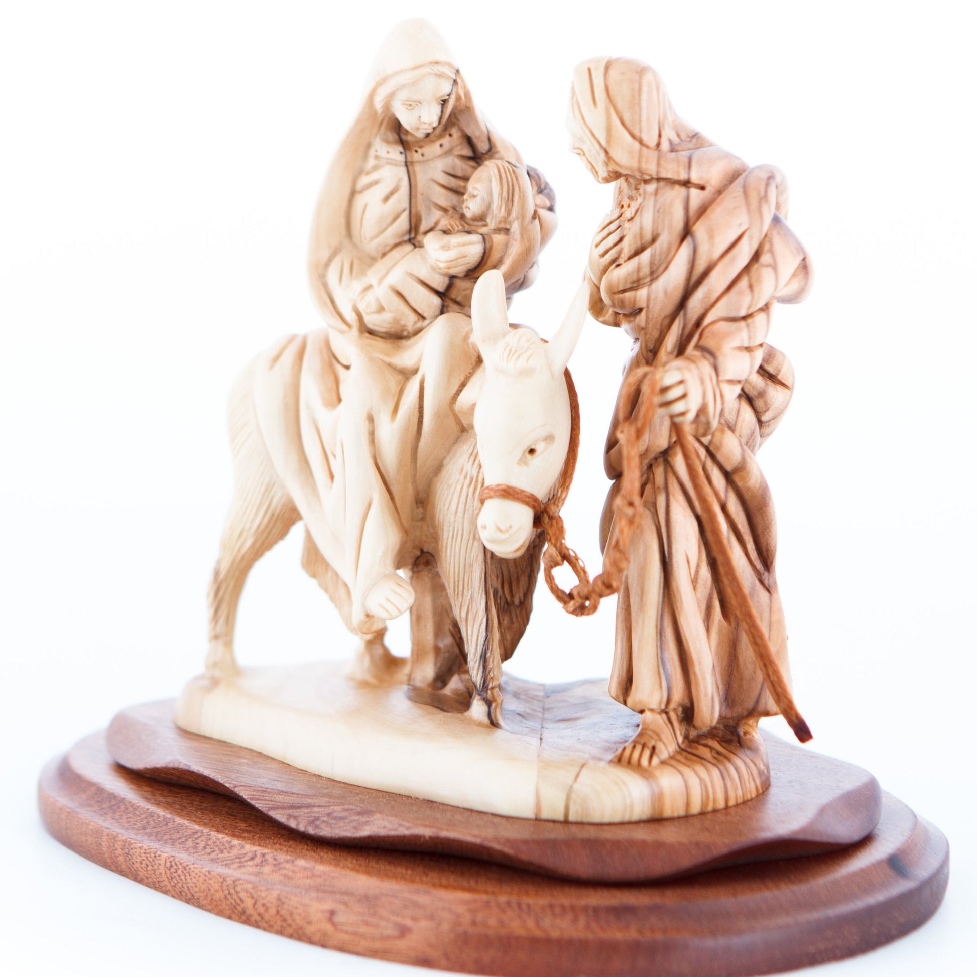 This precious olive wood carving from the Holy Land brings you a sense of security as we see Mary and Joseph care for their son Jesus while on a perilous journey to Egypt.