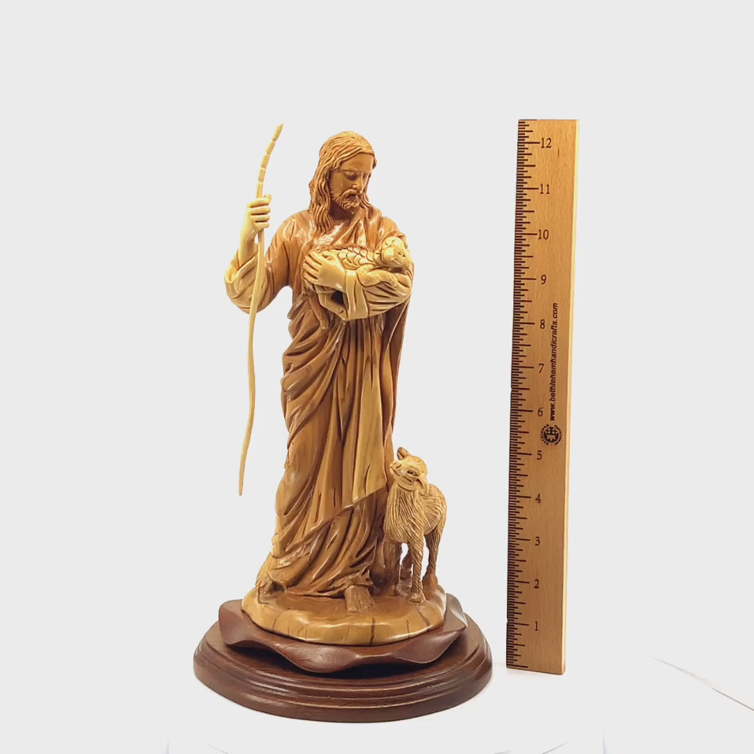 Jesus Christ "The Good Shepherd" Statue, 12.6" Sculpture from Holy Land Olive Wood