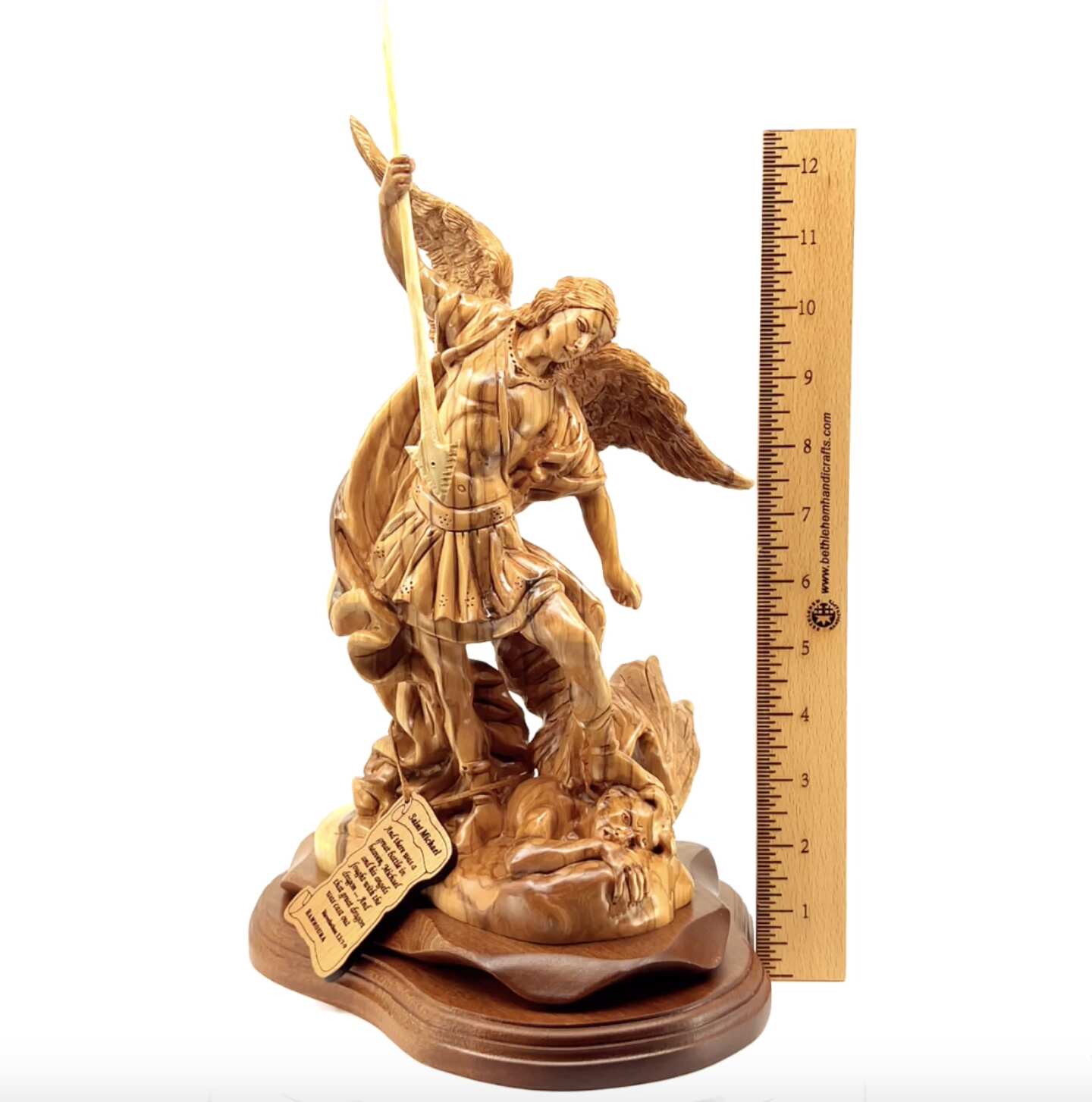 Own an olive wood statue of Saint Michael, the Archangel. This hand carved statue speaks for itself. The figure reflects the heavenly power of St. Michael who defeated Satan and kicked him out of heaven.
