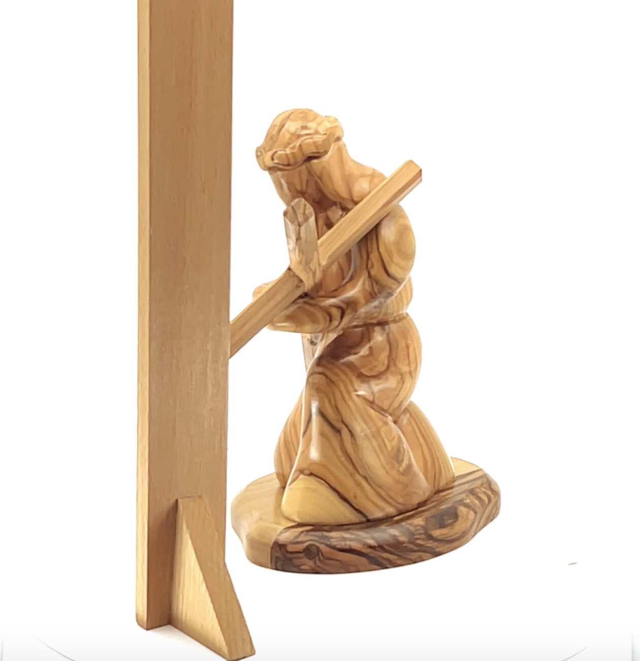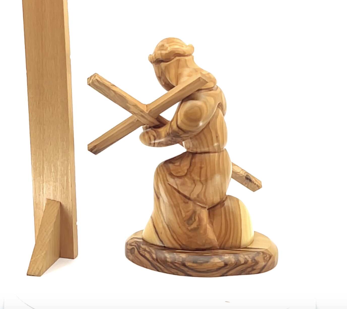 Jesus Christ Kneeling While Holding the Cross, 7.1" Wooden Abstract Carving