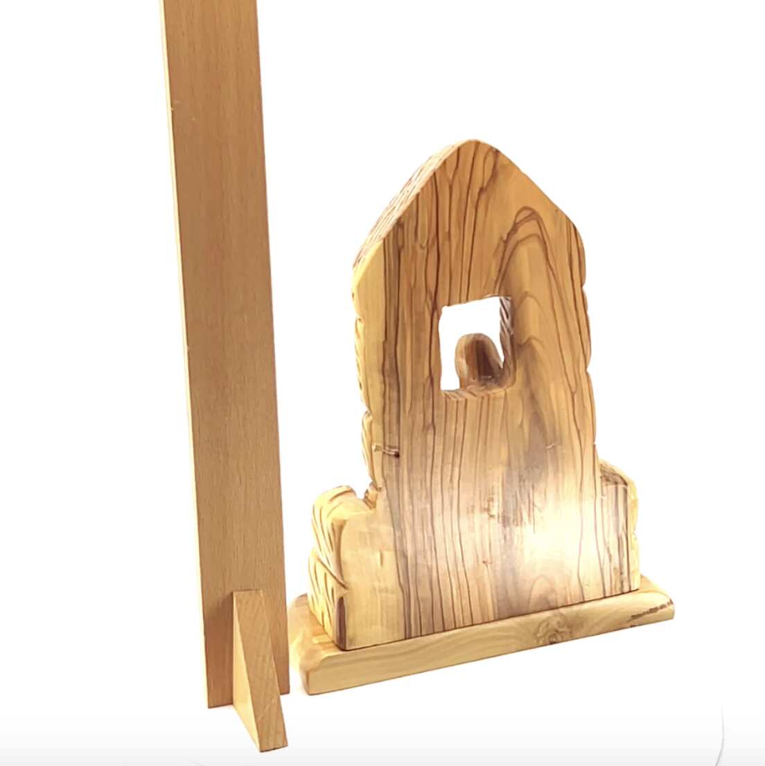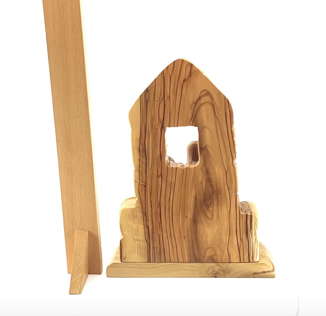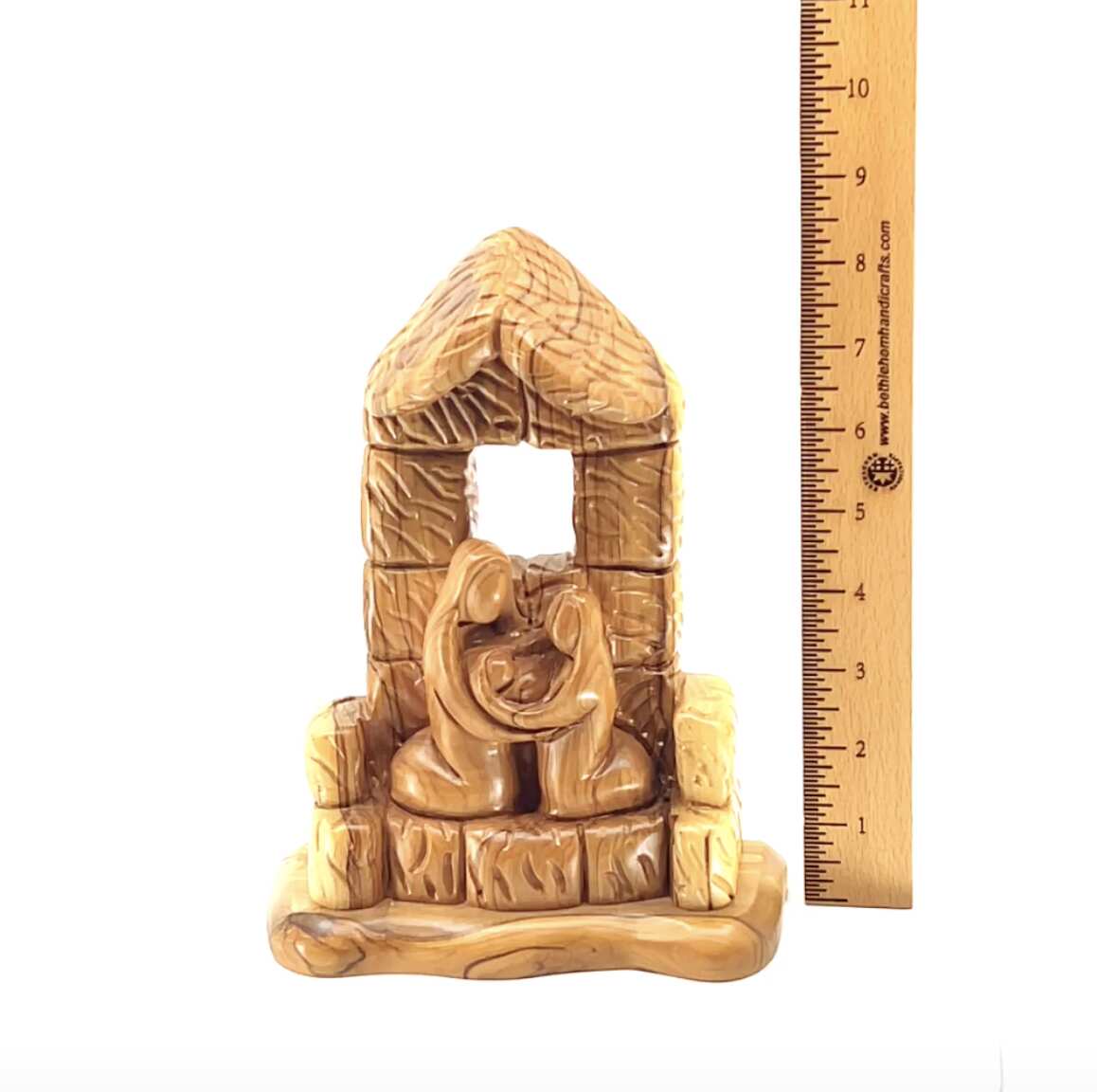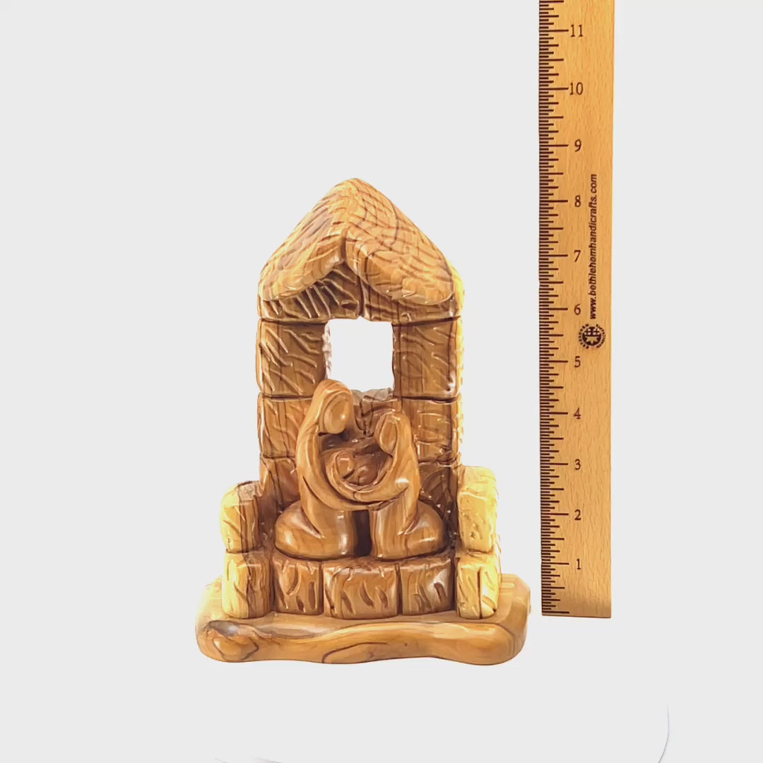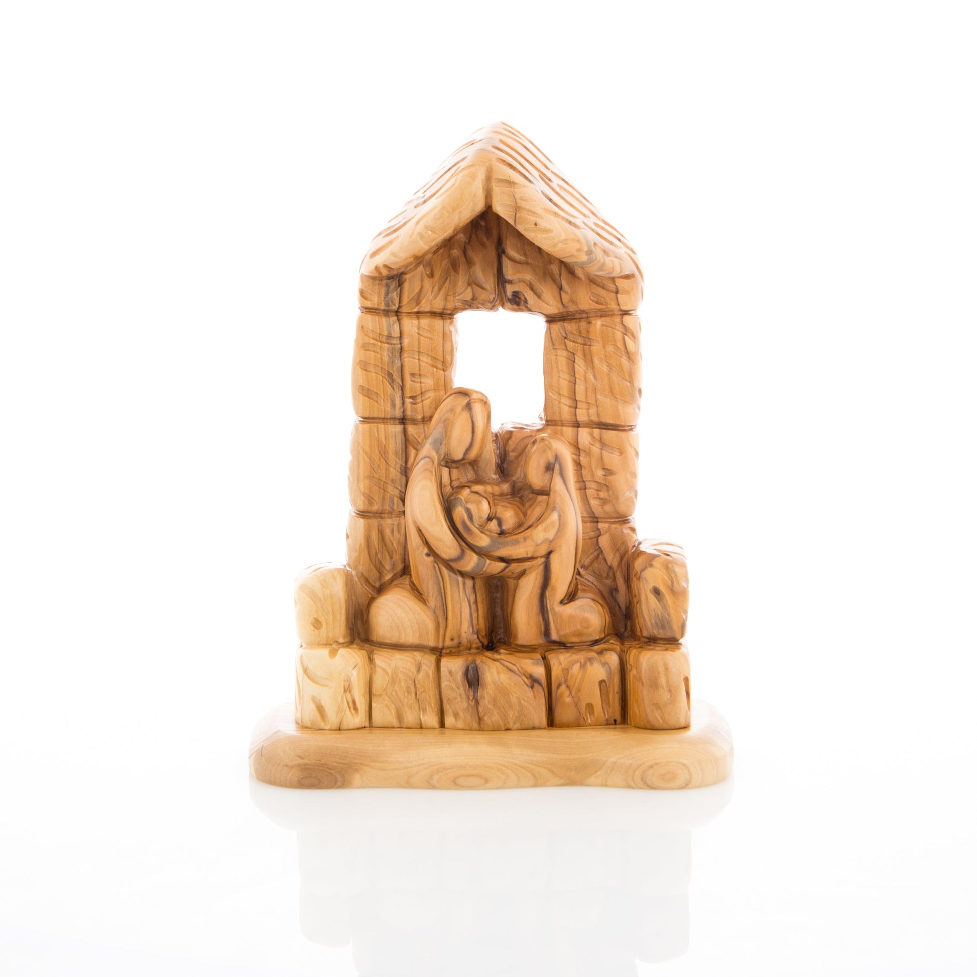 For a perfect Christian home, observe this unique olive wood carving of the Holy family as it is envisioned in gathering together in a manger that is slightly resembling a home. This statue is handcrafted from one piece of aged olive wood by Bethlehemite Christian artisans.