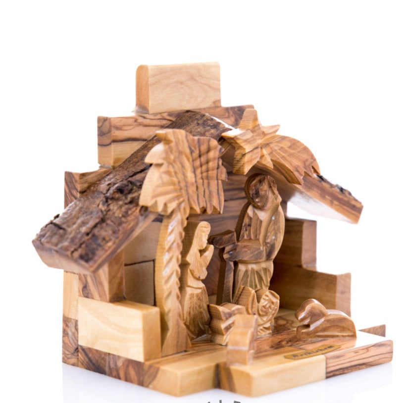 This unique sculpture is hand-carved by Christian artisans in Bethlehem few meters away from the Nativity Church. What's special about this item is the roof of the manger is made out of the olive wood tree's bark that can be up to hundreds of years.