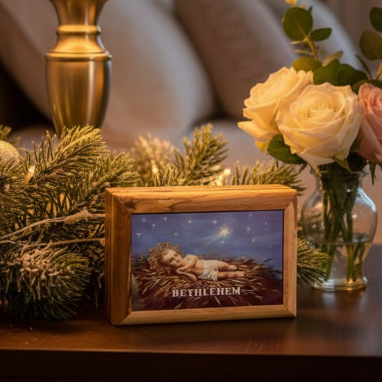 This Baby Jesus in Manager Box is a unique Christian gift, made of olive wood hand-carved in Bethlehem, the birthplace of Jesus. With a printed image of Baby Jesus Christ Manager and an ideal size to fit a rosary, it's perfect for Easter celebrations, Catholic anniversaries, and more. Support Christian artisans with this meaningful and inspirational gift.