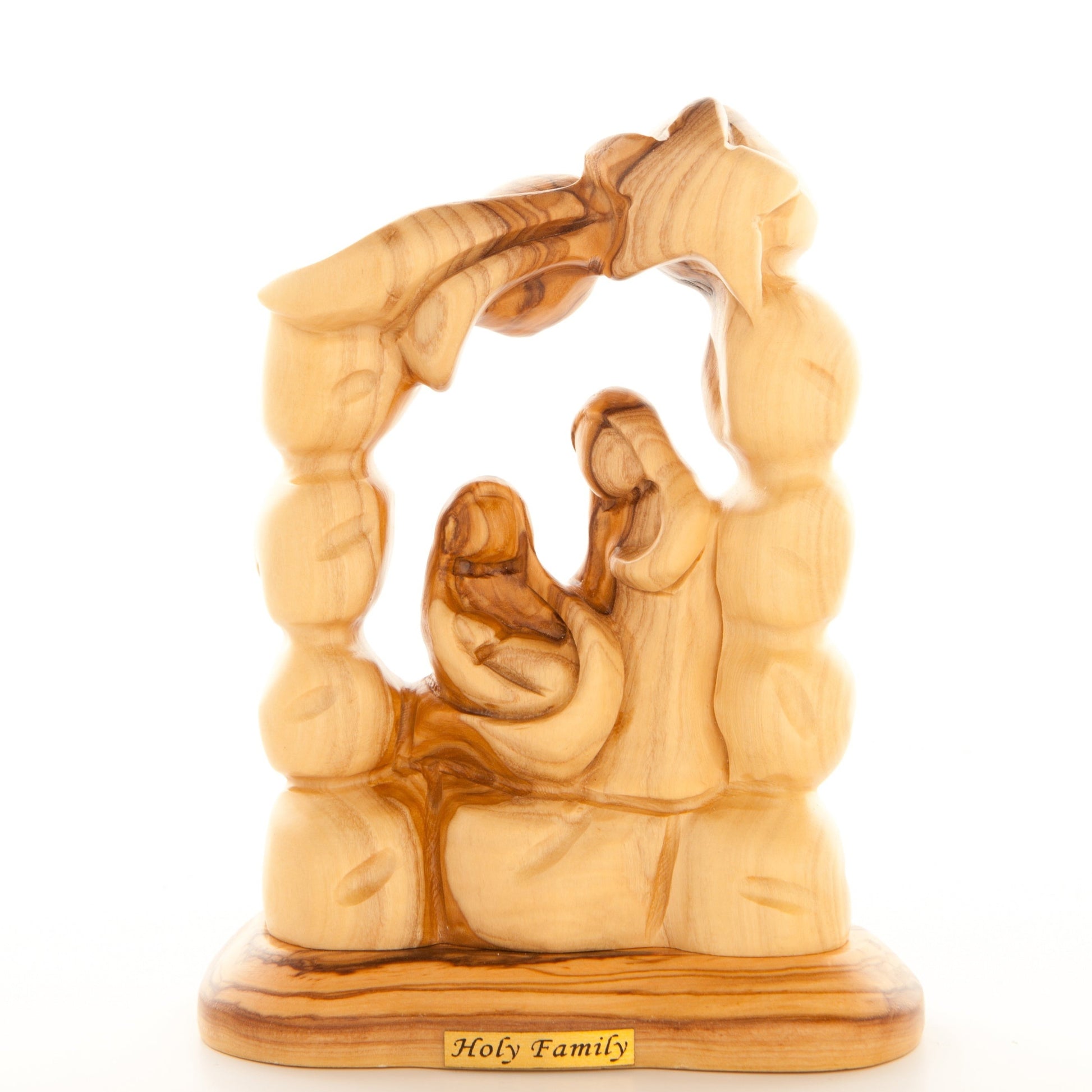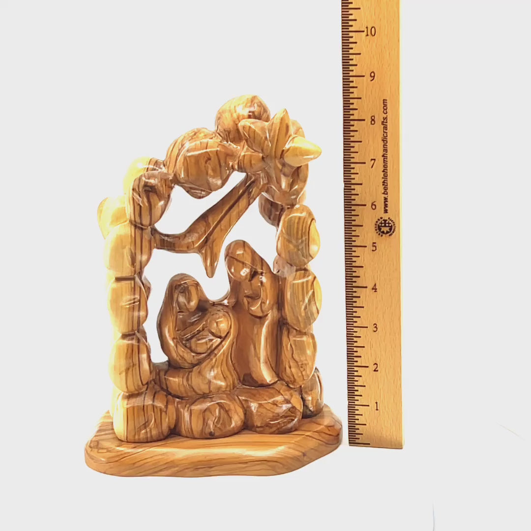 A beautiful scene of the holy family carved from the rare olive wood. This wood handicraft shows the scene of the birth of Jesus Christ in his manger flanked by Joseph and Virgin Mary with the star from the East above them under an arch.