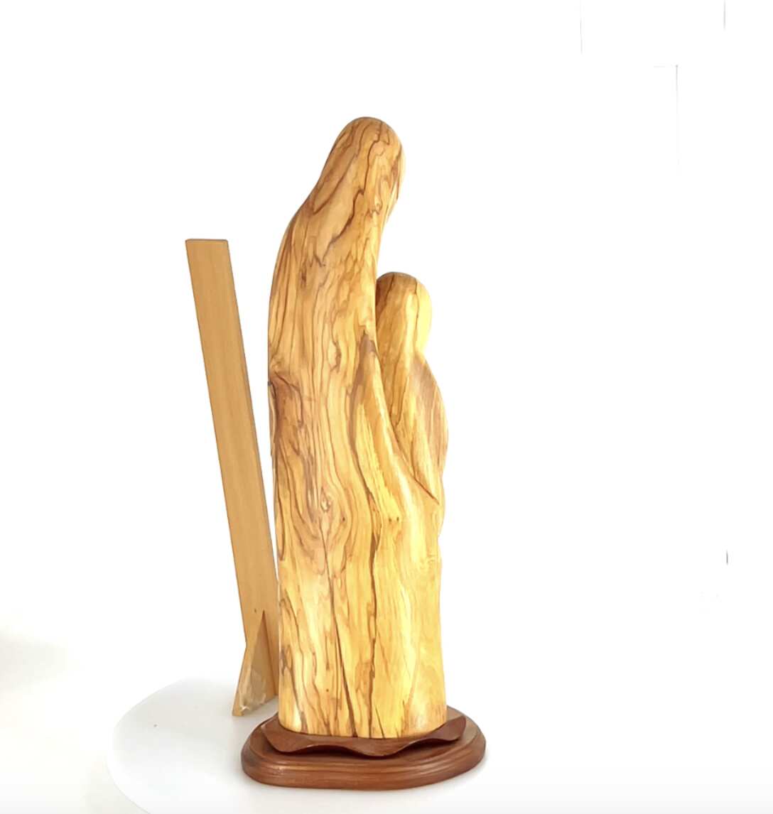 Artistic vision combined with deep faith in our Lord shows you this marvelous olive wood carving made in Bethlehem. Observing it, you see two wooden figures of Saint Joseph and Blessed Virgin Mary coming together around their son Jesus.