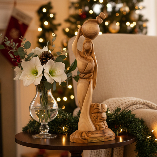This elegant simple hand carved wooden figure carries an earthen water jug reminding us of a Samaritan woman's encounter with Christ at the well.