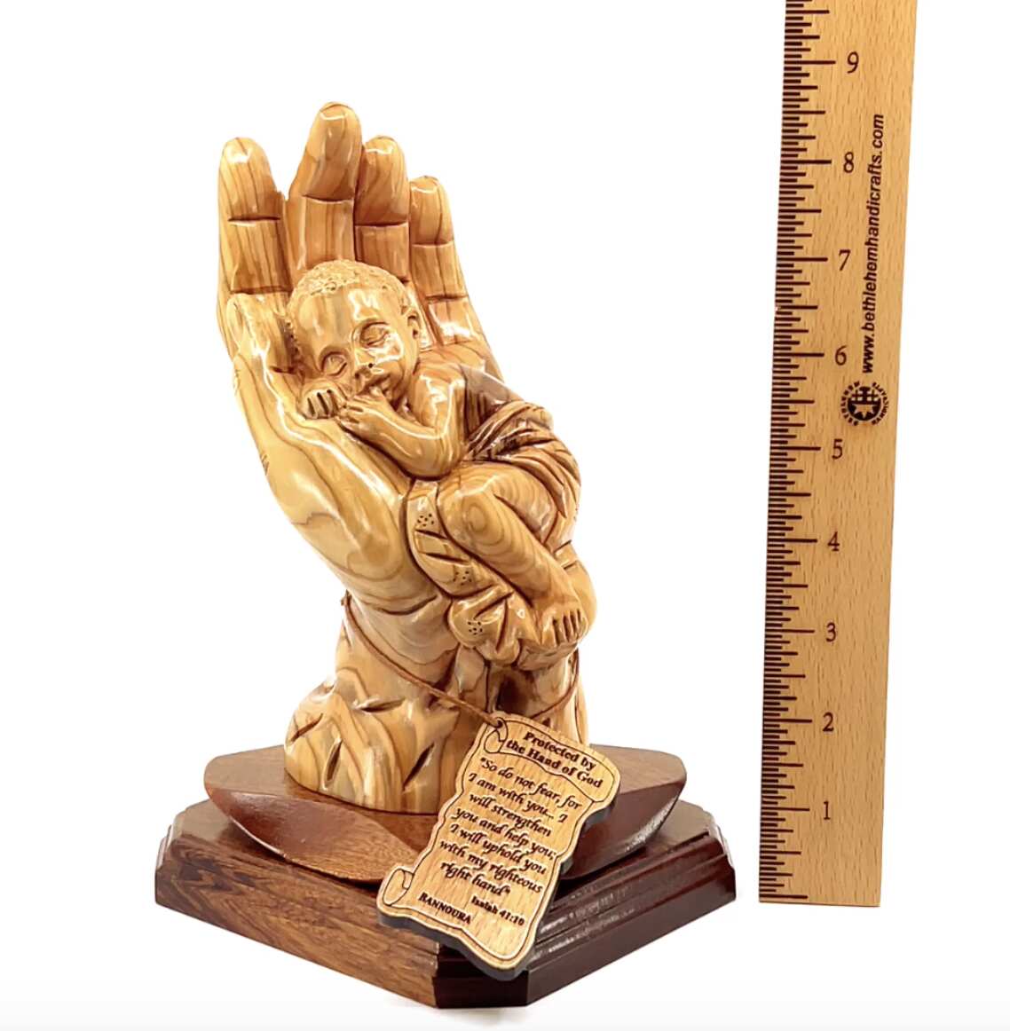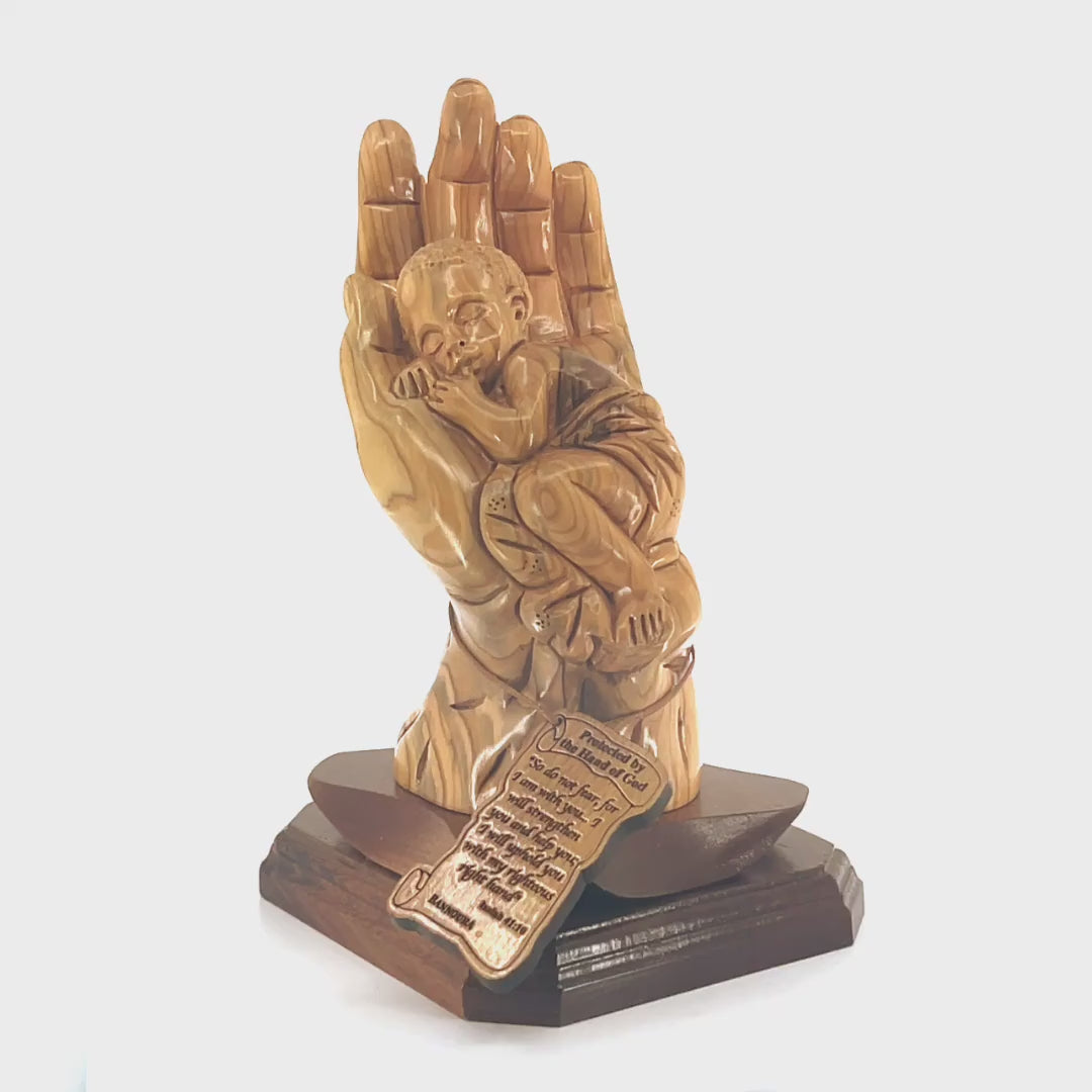 “Protected by the Hand of God” Sculpture 8.5" Tall, Made from Holy Land Olive Wood