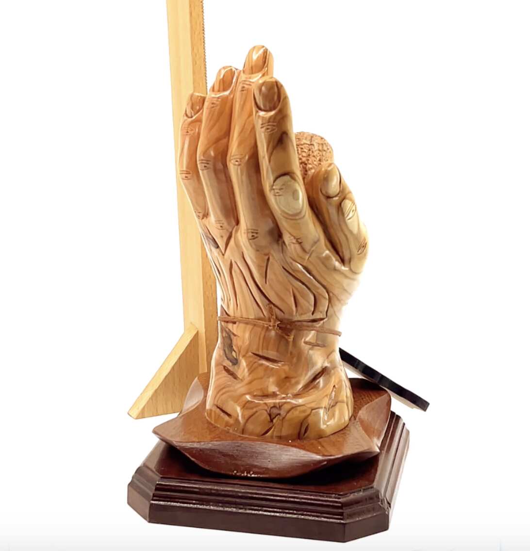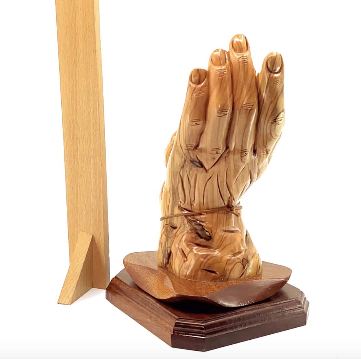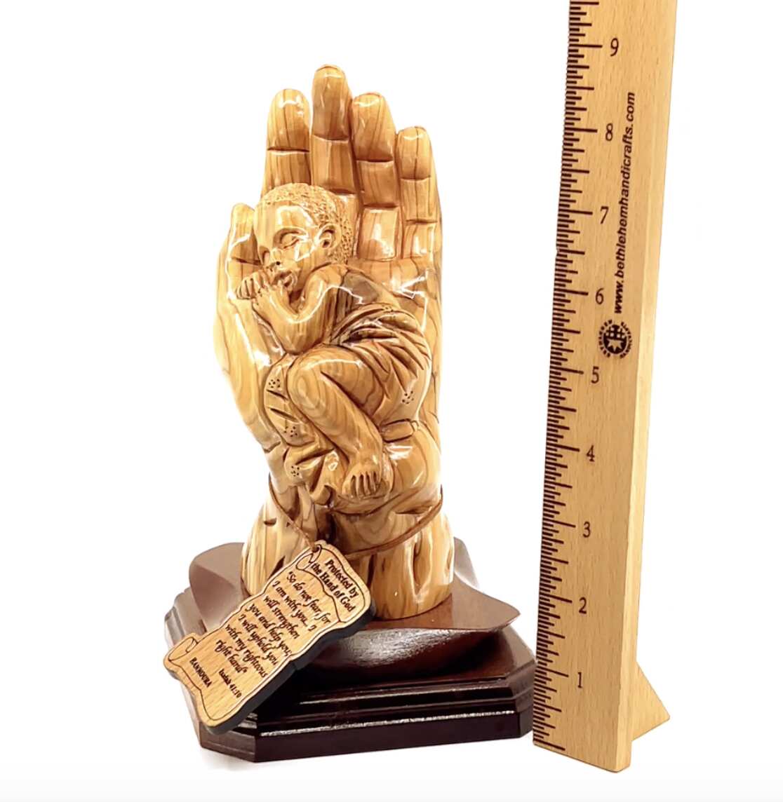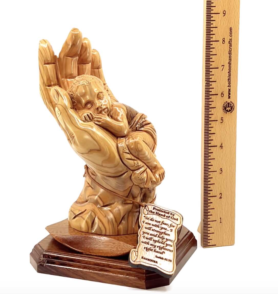“Protected by the Hand of God” Sculpture 8.5" Tall, Made from Christian Artisans in Bethlehem from Olive Wood grown in the Holy Land.