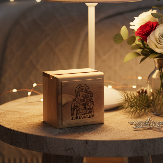 In addition to the soft red felt lining with a magnetic snap closure, this casket has the image of Virgin Mary and Jesus engraved with laser onto the cover and the word “Jerusalem” carved below it to always remind us of the Holy Land.