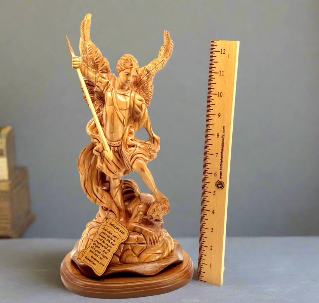 Archangel Michael Sculpture, 13.4" Carving from Holy Land Olive Wood