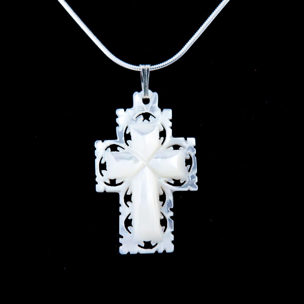 This mother of pearl cross pendant hangs from a delicate 925 sterling silver chain. This elegant cross necklace is made in the Holy Land. Mother of Pearl's color simply stuns anyone who gazes upon it. Keep this necklace near your heart so it can keep your faith strong to walk proudly with Jesus and feed your faith with this everlasting symbol of love and devotion. “If anyone would come after me, let him deny himself and take up his cross and follow me.” Mark 8:34