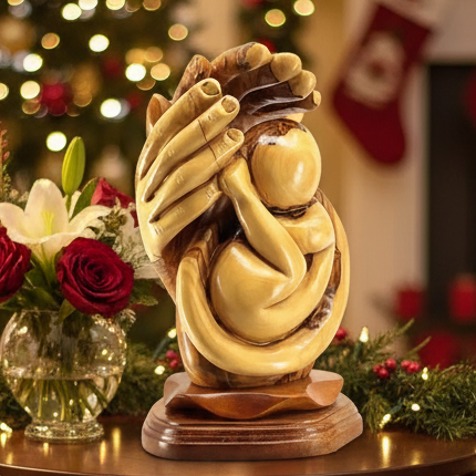 It is life that this magnificent wood handicraft represents, along with the fine details of the hand, covering an unborn child; as if to sanctify and bless it with the Lord's love.